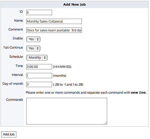 In the Commands field, type the necessary commands for the job you want run. Each command must be on a new line.