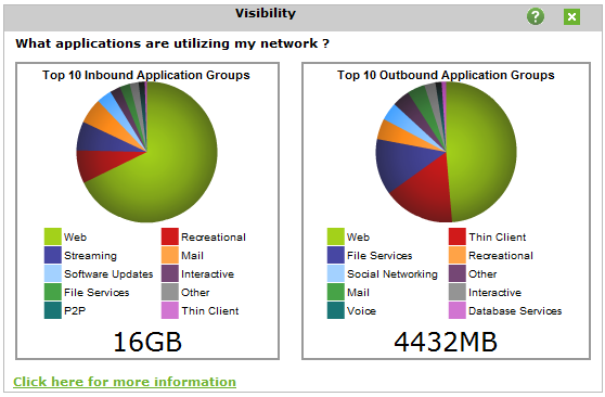 Visibility is essential to understand what is on your network in order to effectively control or protect it. The visibility graphs show the application groups that are utilizing the network. These graphs can answer questions such as "Are streaming applications, such as when users are downloading music and videos, choking the network? Are data backups overrunning my network?"