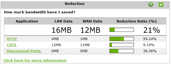 Reduction measures the amount of redundant data that has been removed from the network and has therefore increased free capacity. Data previously seen by the system is "remembered" and delivered from the local appliance rather than end-to-end from server to client resulting in a reduction in the amount of data sent across the network. The reduction ratio compares After Exinda to Before Exinda.