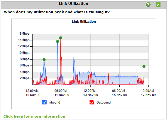 Hover over the green dots on the throughput peaks to see the top conversations, which may be the cause of the network bottlenecks. Without this level of visibility, IT professionals may mistakenly treat the symptoms (for example buy more bandwidth) instead of addressing the cause which is a short term solution at best.