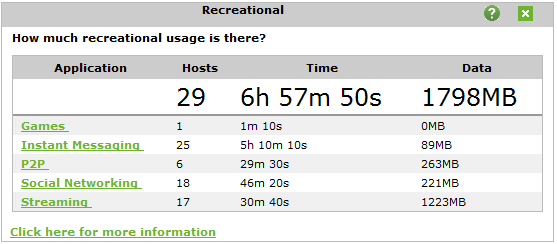 Having visibility into key recreational applications is the first step in being able to manage them. These applications are generally undesirable because they can impact the performance of key business applications, negatively impact customer experience, reduce the productivity of users, introduce viruses to the network and enable downloading of illegal or copyrighted material.