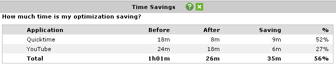 This table shows the improvement in transfer time due to WAN optimization. The Before time is the total amount of time an application would have taken to transfer data without WAN optimization. The After value is the actual amount of time taken with WAN optimization. The difference between the Before and After values is then shown as a time value and as a percentage.